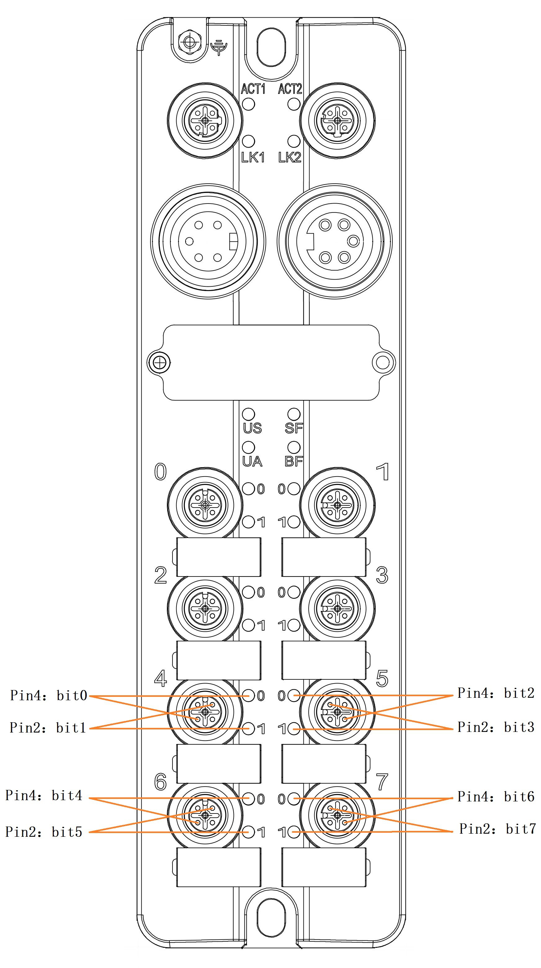 保持寄存器0x0000 字_低位: bit0:输出OFF bit1:输出ON | bit-0:传输I/O端口4的4号引脚输出信号 bit-1:传输I/O端口4的2号引脚输出信号 bit-2:传输I/O端口5的4号引脚输出信号 bit-3:传输I/O端口5的2号引脚输出信号 bit-4:传输I/O端口6的4号引脚输出信号 bit-5:传输I/O端口6的2号引脚输出信号 bit-6:传输I/O端口7的4号引脚输出信号 bit-7:传输I/O端口7的2号引脚输出信号 |