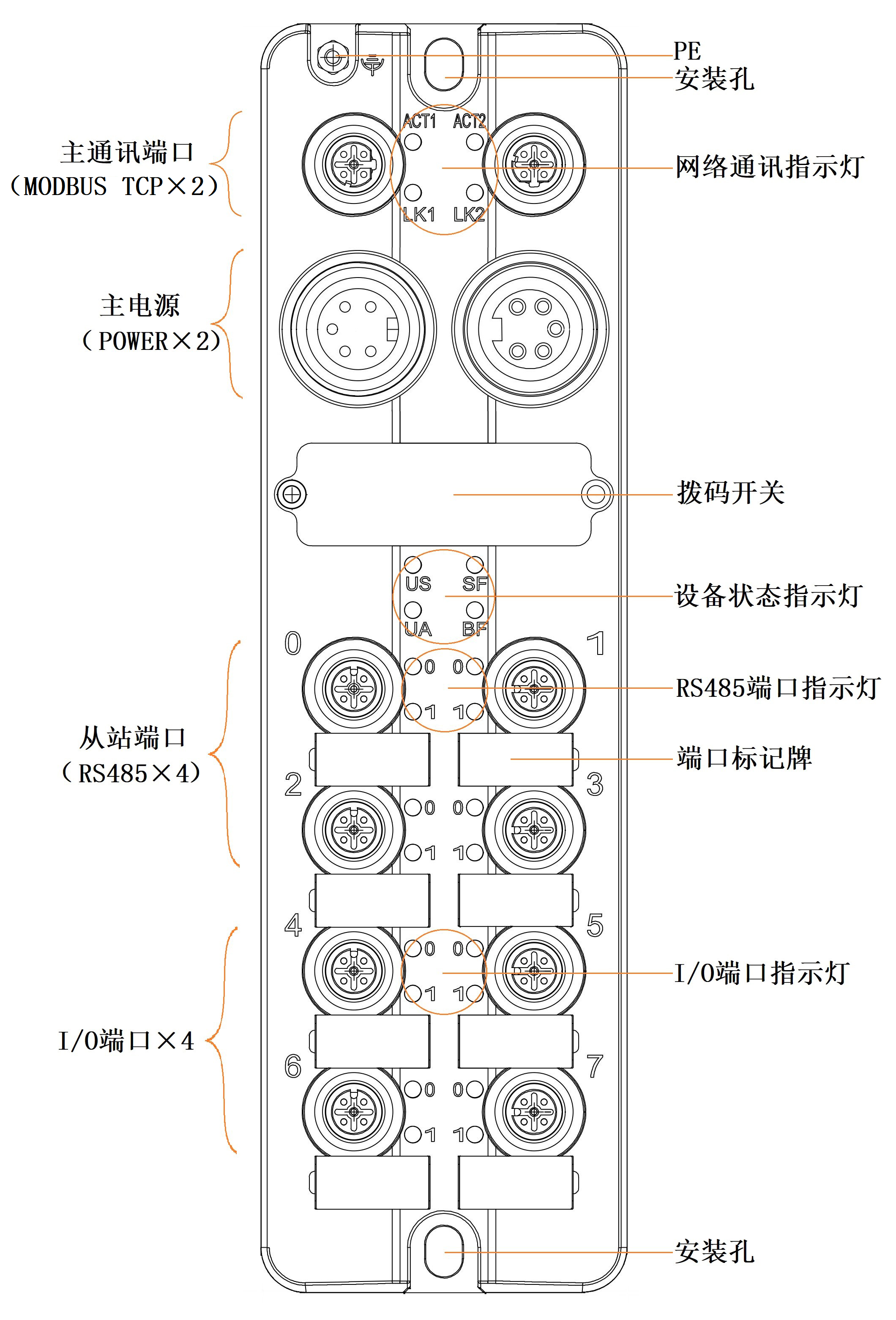 两个MODBUS TCP端口均可作为主通讯端口与上位机通讯,或作为级联口连接下一网关的MODBUS TCP通讯口